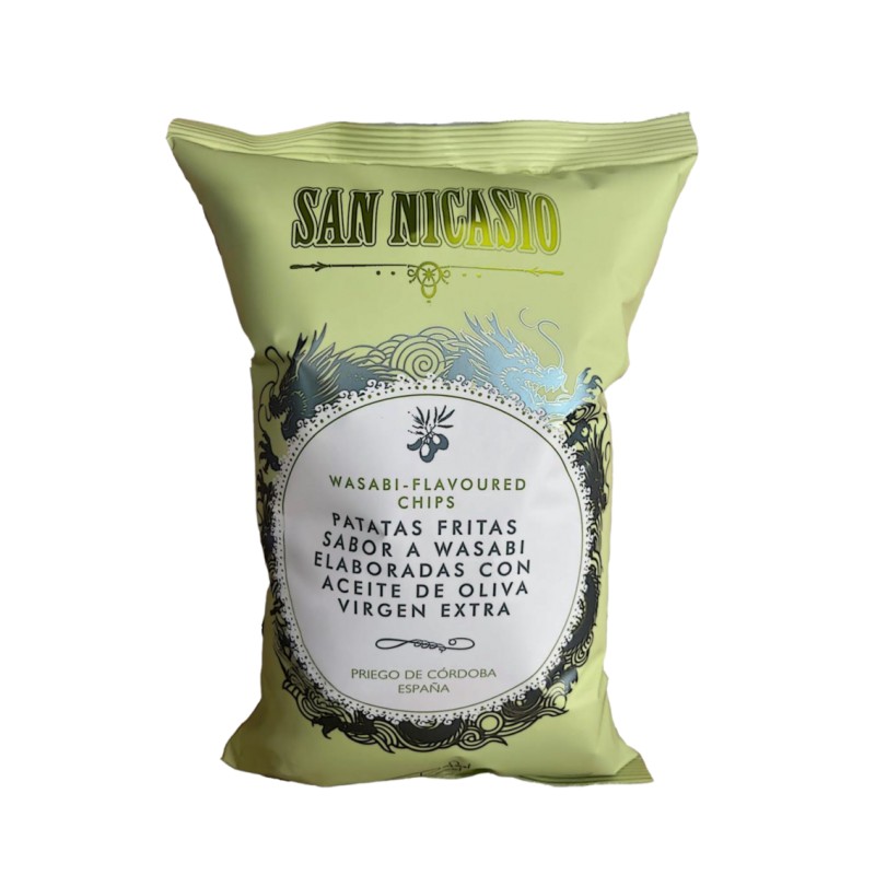 San Nicasio Wasabi Flavoured potato chips are made with extra virgin olive oil from the Almazaras de la Subbética. Delivered as a case of 14 x 150gm bags